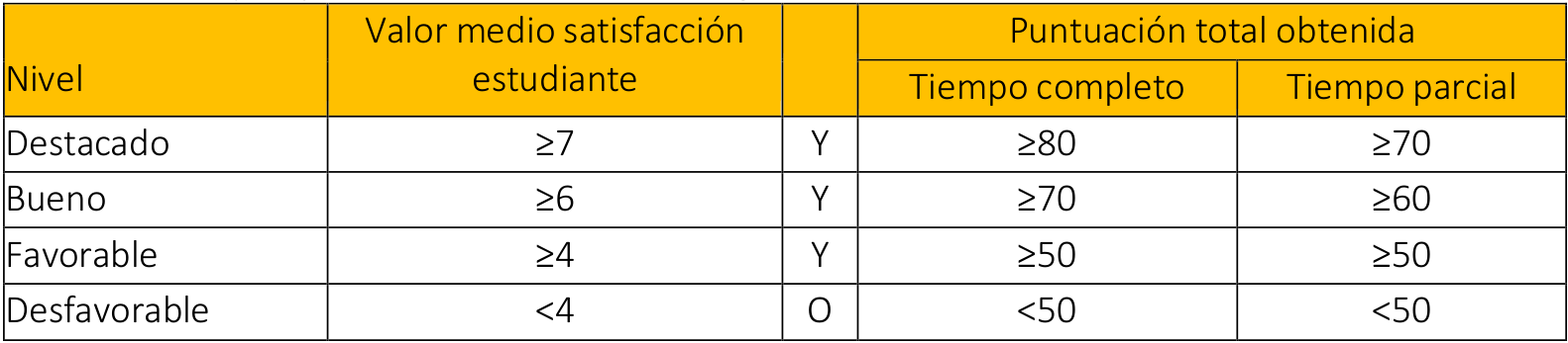 - Valor medio de satisfacción del estudiantado ≥ 8, siempre y cuando tenga más de dos encuestas de distintos cursos académicos, dentro del periodo evaluado.